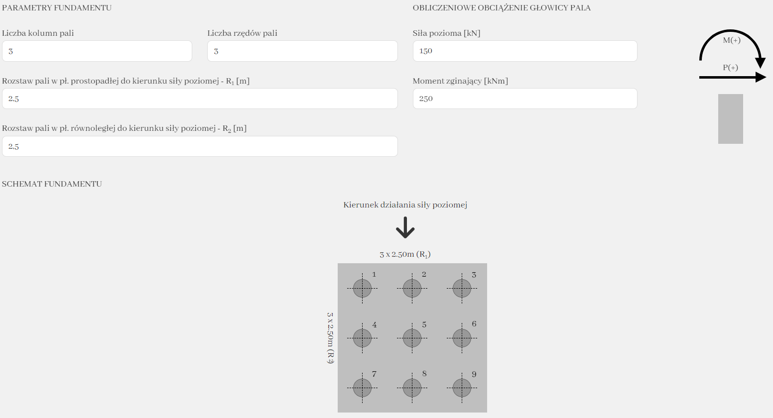 W niniejszej sekcji należy określić parametry geometryczne fundamentu takie jak liczba rzędów i kolumn oraz rozstaw pali w płaszczyźnie równoległej i prostopadłej do kierunku działania siły. Drugim elementem do podania są siły działające na głowicę pala (siła pozioma oraz moment zginający działający na głowicę pala).