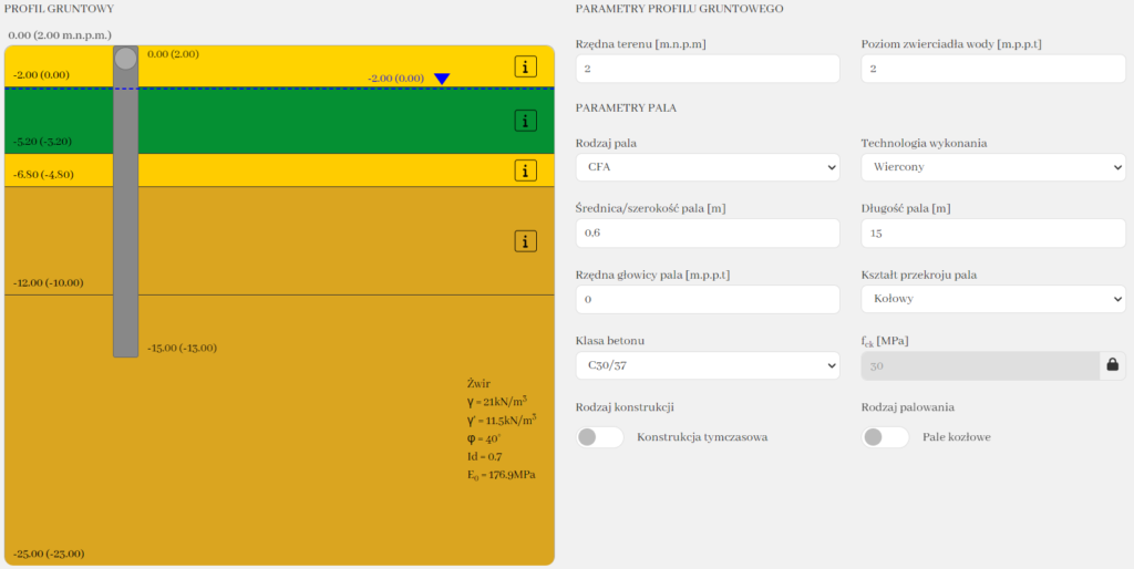 Drugim krokiem po zdefiniowaniu parametrów podłoża jest określenie parametrów modelu i pala takich jak rzędne terenu i rzędna zwierciadła wody gruntowej, rodzaj pala, technologia wykonania, średnica i długość pala, klasa betonu i stali itd. Należy określić rodzaj konstrukcji jako tymczasową lub stałą oraz czy pale są pionowe czy kozłowe. Do wyboru mamy następujące rodzaje pali: