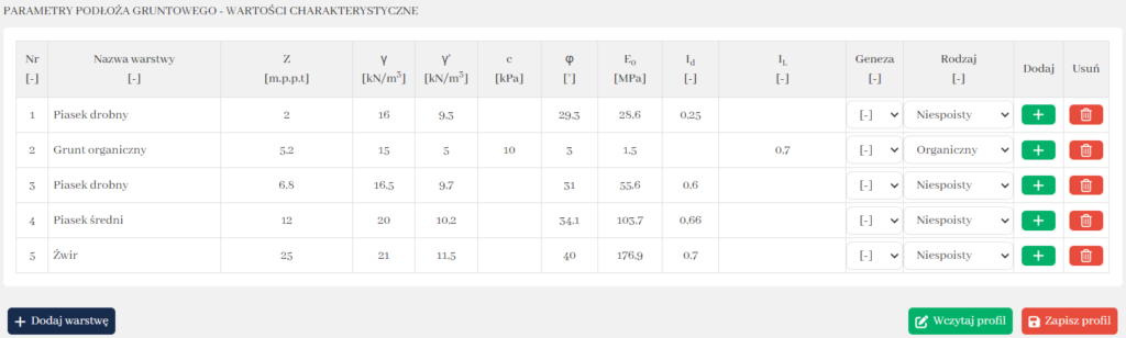 Tabelę parametrów gruntowych należy wypełnić wymaganymi wartościami (γ, γ’, c, φ, E0, Id, IL) na podstawie badań podłoża. Dostępna jest opcja automatycznego doboru parametrów gruntowych na podstawie normy PN-81 B-03020 podając stopień zagęszczenia Id lub wskaźnik plastyczności IL