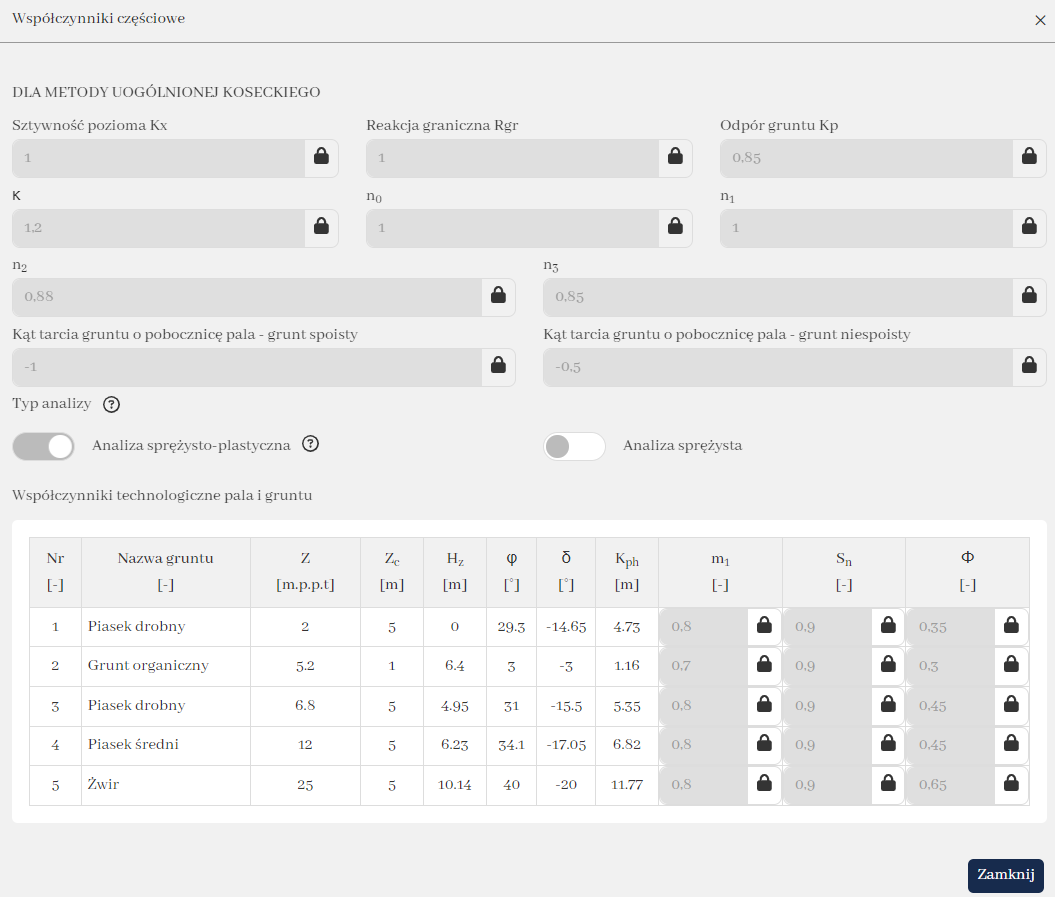 W oknie dotyczącym współczynników technologicznych metody uogólnionej możliwa jest edycja współczynników częściowych dla sztywności Kx, reakcji granicznej Rgr oraz odporu gruntu Kp oraz współczynników wynikających z metody obliczeniowej. Do wyboru jest rodzaj analizy jako analiza sprężysto-plastyczna lub analiza sprężysta. W tabeli podsumowującej jest możliwość edycji współczynników m1, Sn, Φ dla każdej z warstw profilu geotechnicznego.