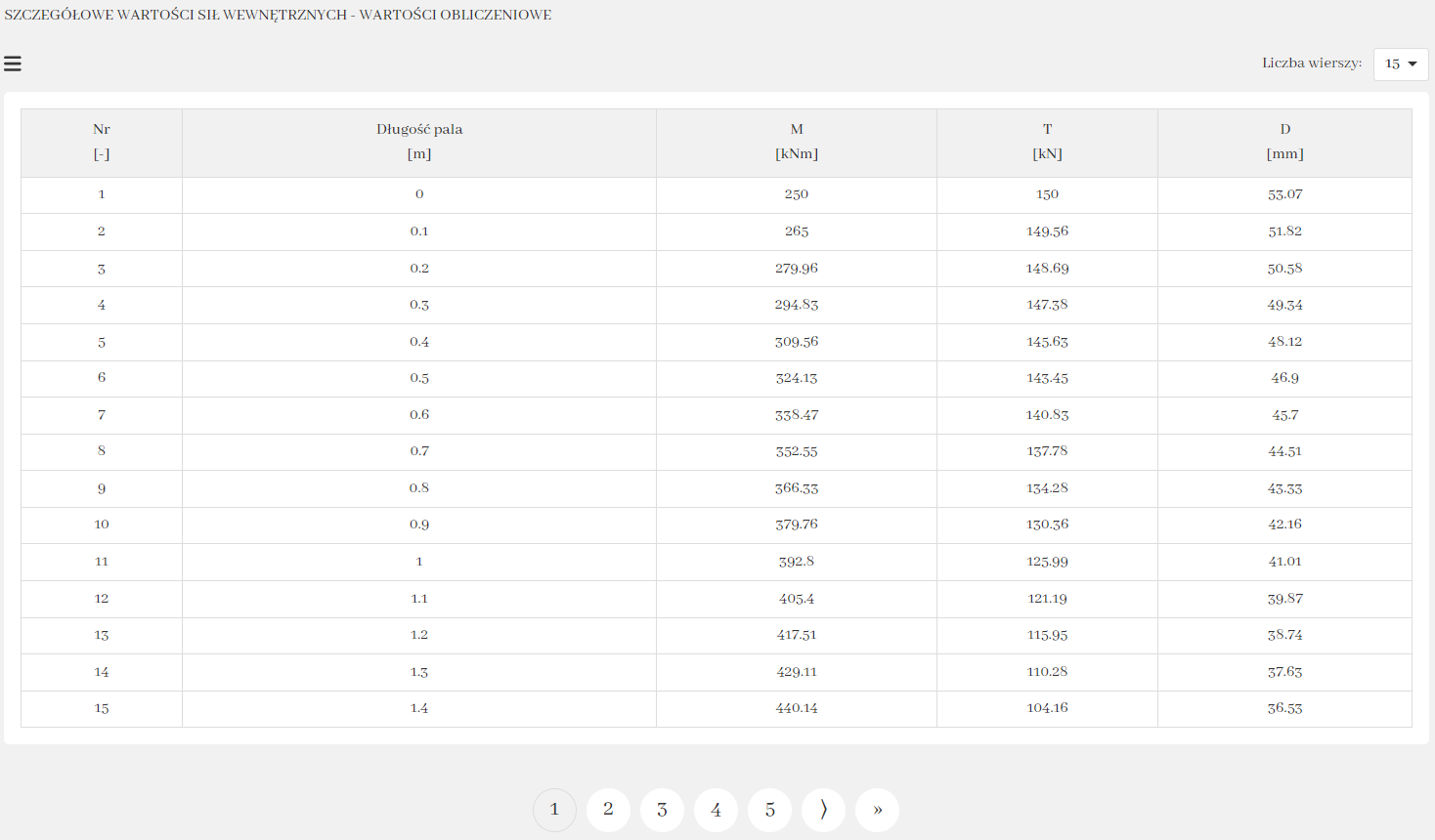 Wyniki w postaci tabelarycznej zawierają szczegółowe informacje na temat sił wewnętrznych i przemieszczenia wzdłuż pala oraz wartości sztywności poziomej gruntu kx i reakcji granicznej Rgr. Wartości określone są w węzłach wzdłuż pala rozmieszczonych co 10cm. Tabele można pobrać w formacie CSV i edytować wg własnych potrzeb. Najczęstszym zastosowaniem jest wykorzystanie wartości z tabeli do stworzenia charakterystyk podpór sprężystych lub biliniowych np w programie Robot.