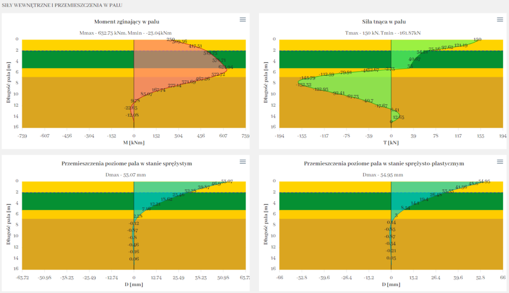 Podstawowym widokiem zakładki z wynikami są wykresy sił wewnętrznych (momenty zginające oraz siły tnące w palu) oraz wykresy przemieszczenia pala w fazie sprężysto plastycznej oraz sprężystej. Istnieje możliwość pobrania wykresów w formacie svg lub png i wykorzystania ich np. w opisie technicznym. Dodatkowo w sekcji z wynikami znajdują się wykresy reakcji poziomej gruntu Kx oraz oporu granicznego Qgr wzdłuż pala.
