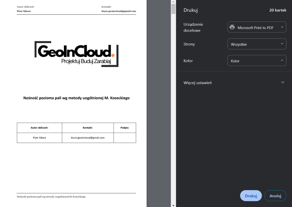 Raport z obliczeń dostępny jest gdy wyniki są aktualne. Przed wydrukowaniem raportu mamy możliwość wyboru informacji jakie mają się w nim znaleźć. W raporcie możemy umieścić wszystkie dane wejściowe takie jak tabelę parametrów gruntowych, parametry modelu, pala oraz współczynniki technologiczne jak i pełne wyniki, czyli wykresy sił wewnętrznych, rozkłady oporów sztywności poziomej gruntu i oporu granicznego a także szczegółowe tabele.