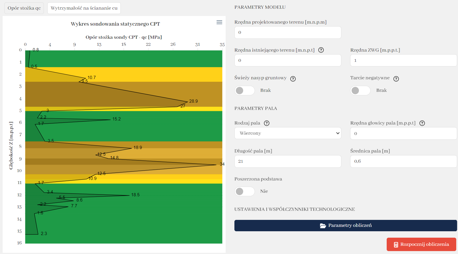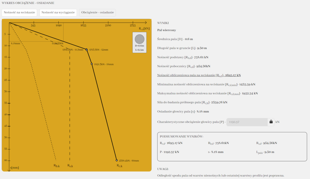 Podstawowym widokiem zakładki z wynikami są wykresy nośności pala na wciskanie, wyciąganie oraz wykres obciążenie – osiadanie. Obok części graficznej znajduje się opisowe podsumowanie obliczeń z takimi wynikami jak nośność pala na wciskanie, osiadanie głowicy pala, siła do badania próbnego itd.