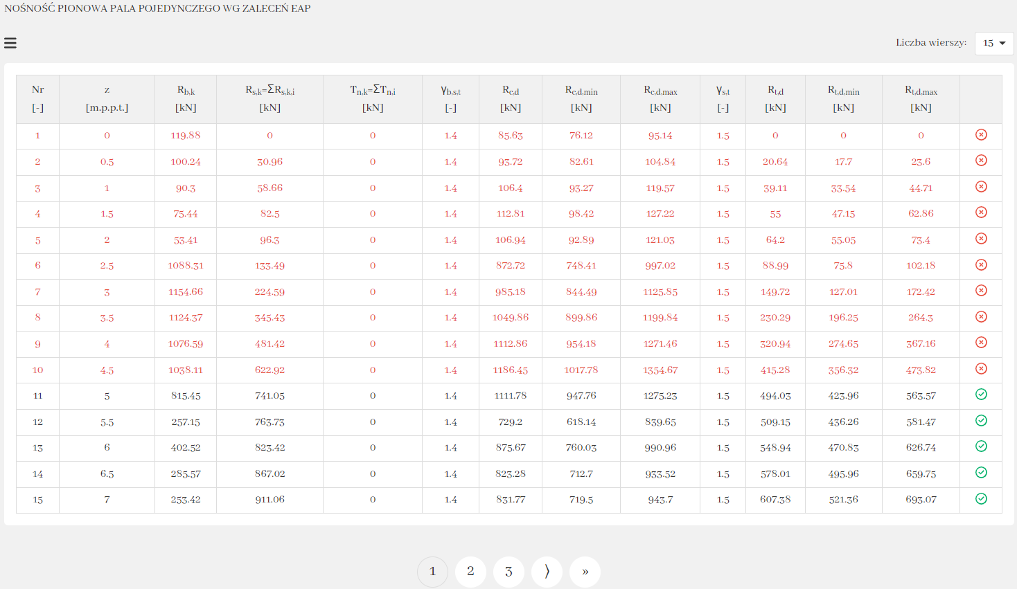 Tabele zawierają szczegółowe wyniki nośności w węzłach pala wzdłuż przekroju geotechnicznego. Tabele można eksportować do plików CSV i edytować wg własnego uznania np. w programie Excel.