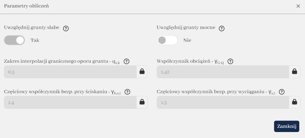W oknie ustawień mamy możliwość dostosowania wielkości współczynników bezpieczeństwa oraz zdecydować czy grunty słabe lub mocne zgodnie z EAP mają zostać uwzględnione w obliczeniach.